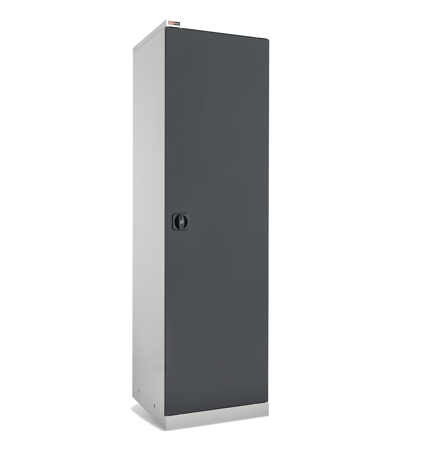 Дверца оборудована поворотной ручкой с ключевым замком, которая приводит в действие ригельную систему и надёжно запирает шкаф по двум сторонам.